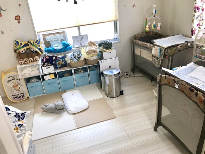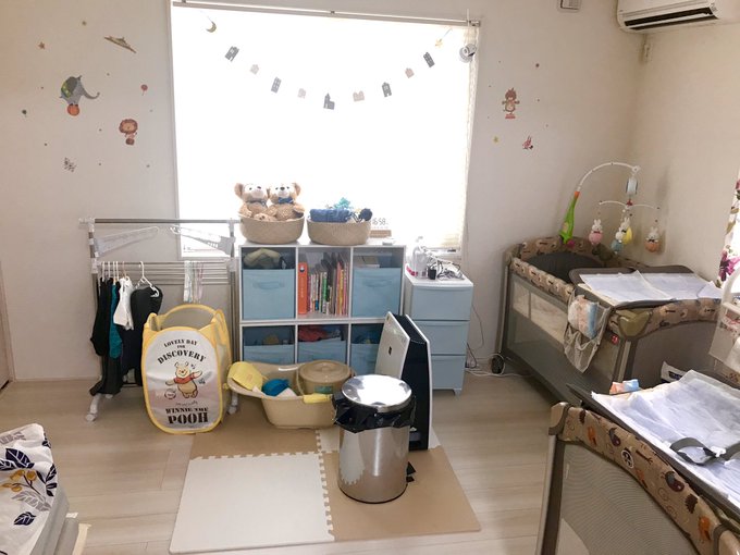 5ヶ月に入った我が家のベビールーム。 結局赤ちゃんは日中リビングの敷きマットエリアで遊んでる。加湿器はしまった。 ベッド付属のオムツ替え台が8㎏までしか対応してない(現在7㎏台)のと、ベッドも10㎏までしか対応してないので夏が終わる頃にはお布団デビューかな。様子見✍️ pic.twitter.com/qf36nfFRXx
