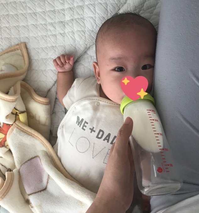 生後4.5-5ヶ月 じっと親の顔を見ながら飲むように。安心してニッコリ。 明確な意思を持って物を掴める様に。 16-4時→現在18-6時まとまって寝るようになった。夜泣きなし。 相変わらず吐き戻しはあるが飲んでる最中に口から横漏れすることはほぼなくなった。 首は兄ほぼ安定、弟微妙 #双子一年目記録 pic.twitter.com/0OEKxQpMNq