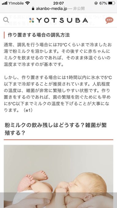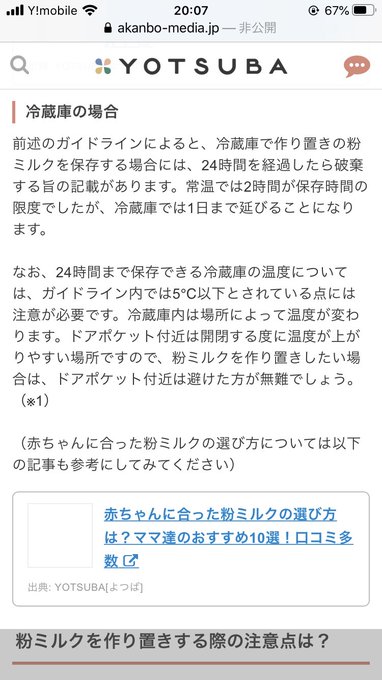 一応考え方としては粉ミルクに含まれる微量の菌は70度以上のお湯で溶いて冷ますし、冷蔵庫での保管も24時間ならOK出てるから安全面で大丈夫ではないかと思った。 また濃縮ではなく等倍のミルクの作り置きだと温めに時間がかかるため、湯冷めと逆の発想で冷えたミルクに熱湯もいけると思った。 pic.twitter.com/D47ZndCbyZ
