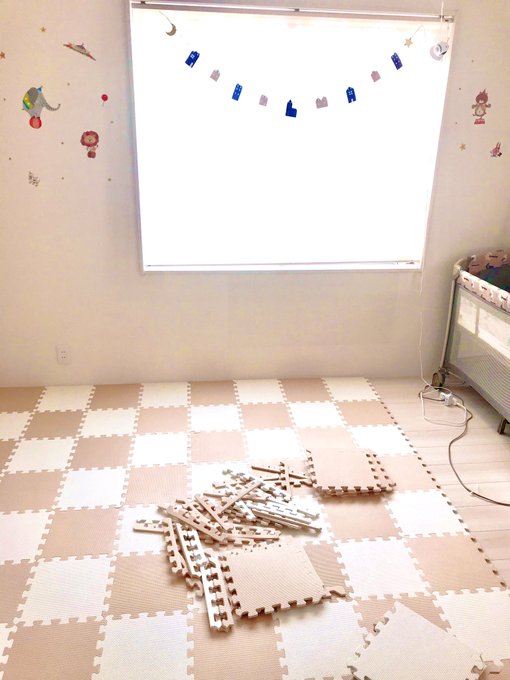 6ヶ月のベビールーム。 寝返りを2人ともマスターしたのでジョイントマットを敷き詰めました。 その上にキルトマットを敷いて完成! 実母に絵本をたくさん読んでもらって双子達はすやすや。 難点といえば窓からの日差しが結構入ること。一応シャッター降ろすことは出来るけど一気に真っ暗に💦 pic.twitter.com/aRTvd81EVW