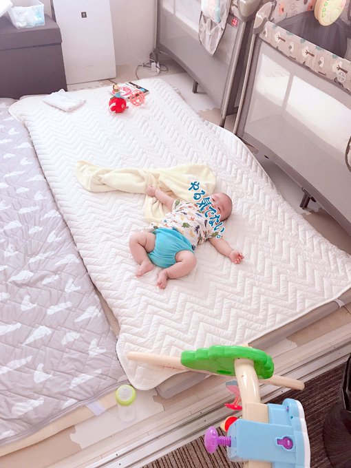 結局ジョイントマット敷いたエリアに布団ひいてみんなで仲良く本読んだりしてゴロゴロ過ごしたよ。 双子兄が一夜にして寝返りからの上半身がやや安定したのと、うつ伏せてしまっても横向きで呼吸出来る様になったからひとまずSIDSの不安がちょっと抑えられたかな。 相変わらず寝返り→ヨーグルト生成🐮 pic.twitter.com/FD6ashj95G