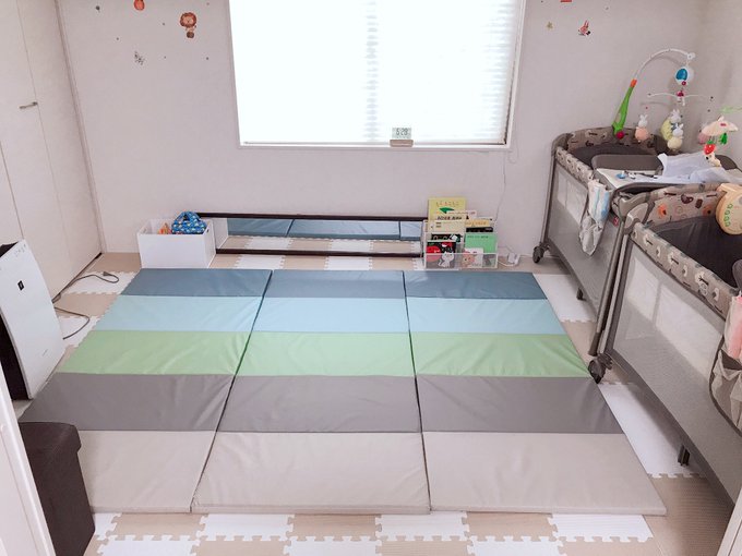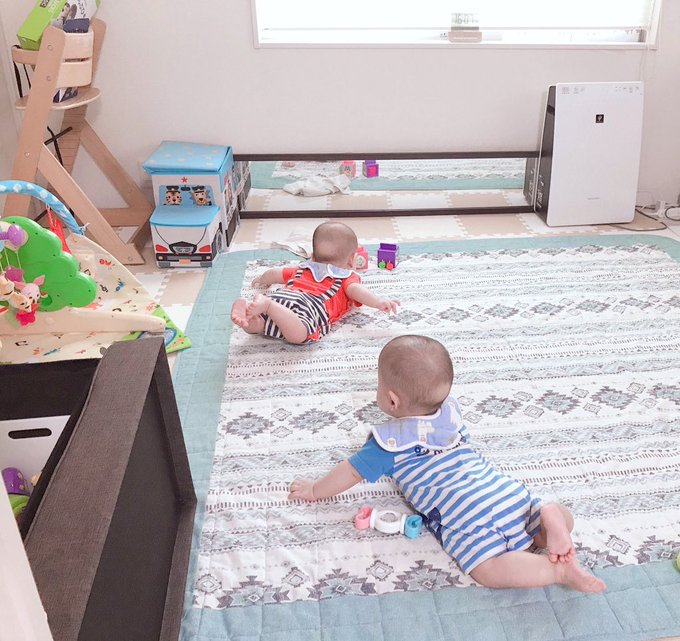 7ヶ月の子供部屋 最近ブーン✈️ブーム到来! なので低い位置に姿見を横倒しして、鏡で自分の姿を確認出来る様にしてみたよ 興味津々で鏡に映った自分を見ている双子。 モンテッソーリ教育にも鏡は良いとされてて、同じ双子ママのまどぅーさんに影響されて設置してみました😚 madokasuzuki.com/monte-mirror pic.twitter.com/zbRDK32mak