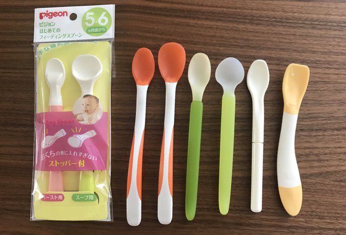 今持ってる離乳食初期スプーンの中で優秀だと思うのが、左端のピジョンのストッパー付きの物。 続いてその隣のオレンジ色のスプーン。 温度で色が変わるアカホン限定商品。最初はなくてもいいと思ってたけどレンチンする事って案外多いし、冷凍するようになったら多用すると思う。 口サイズも大事🥄 pic.twitter.com/j6uFUeheXA
