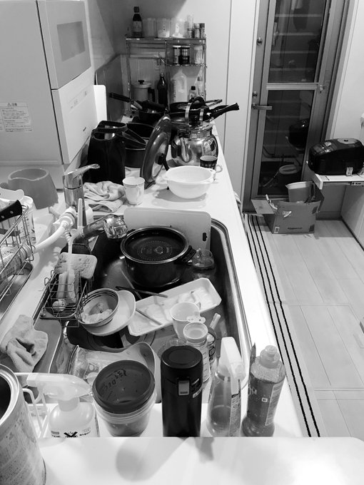 夫が帰宅後使ったフライパンや食器をさらにそのままに。