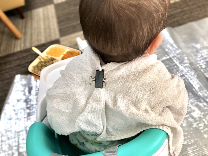 毎回離乳食のたびにスタイしてその上に離乳食エプロンして、それを洗って干すの本当に嫌気がさしてフェイスタオルにクリップした。