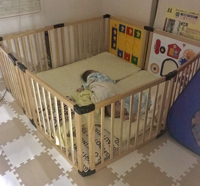 ベビーサークルが日常使いには小さすぎたので、双子の寝床専用サークルになってる。